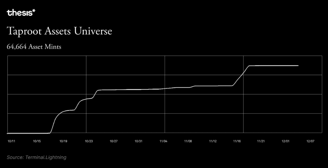 Taproot Assets 目前在比特币上的交易和价值数据很少。虽然网络上已有近 65000 个独特的资产铸币厂,但该协议还处于最初的实施阶段,因此这些铸币厂在很大程度上都是试验性的。