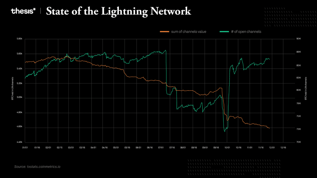 通道数量减少,而总价值却没有相应地长期下降,这意味着向大型通道的转移。这一趋势表明网络中的流动性有所集中,可能表明通道管理或用户行为发生了战略性转变。