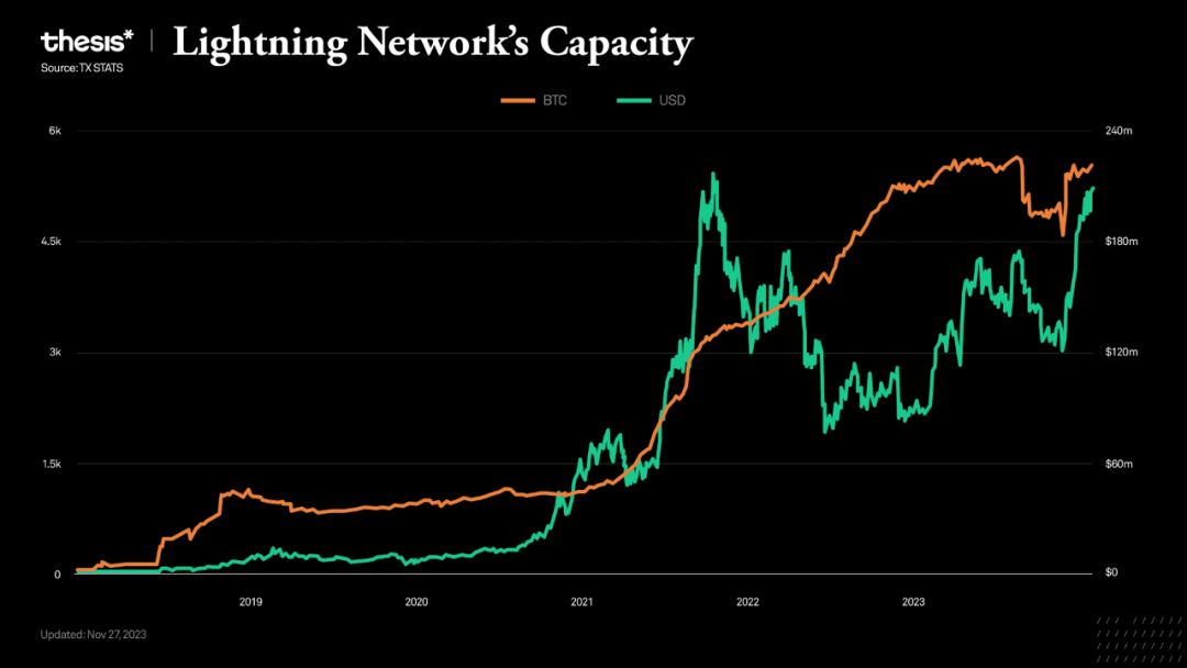 2023 年,价值超过 2.3 亿美元的 5400 多枚比特币通过闪电网络(LN)的支付渠道流动。容量从 2018 年 8 月的 1 BTC 猛增到今天的强大流动性池。支持这一增长的是由 BlueWallet、Muun 和 Phoenix 等领先供应商提供的 70 多个支持 LN 的钱包。采用者既有饱受通货膨胀蹂躏的国家的公民,也有全球性公司。