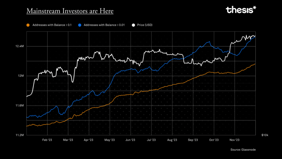 在过去一年中,持有 0.1 BTC 至 0.01 BTC 之间余额的地址数量逐渐增加,这表明散户对比特币作为一种有吸引力的投资资产的兴趣日益浓厚。在利率持续走高情况下,传统市场的表现并不明朗,主流投资者纷纷寻求稳健的替代品。比特币的稀缺性和程序化货币政策一直是安全存储价值的首要因素。现在,零售规模参与者的加入为下一波大规模应用奠定了基础。