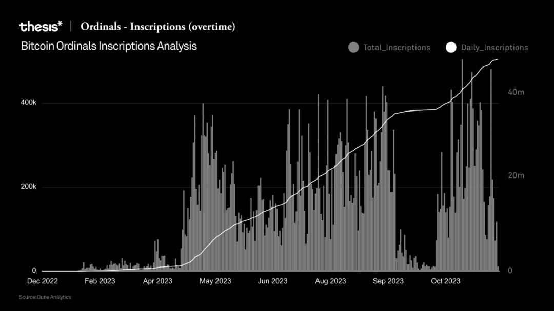 随着 Ordinals 的兴起,NFT 销售额下降 8.7%,从 2021 年 9 月的 42 亿美元降至 2023 年 10 月的 38 亿美元。Ordinals 的推出导致比特币交易费用和区块大小激增,链上的铭文数量达到了惊人的 45074477 个。2023 年 11 月 12 日,比特币 Ordinals 登记量达到 505345 个,创下单日最高纪录。
