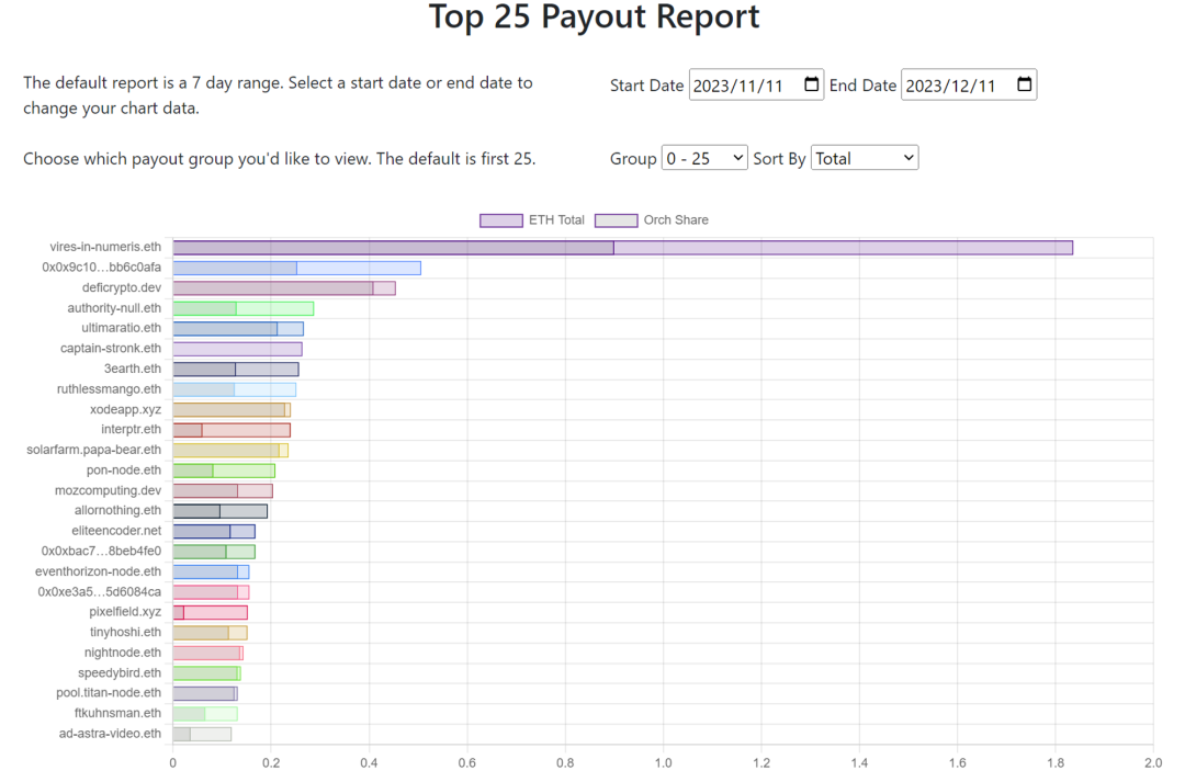 除了通胀的 LPT 奖励外,节点运行者还能通过网络上的视频转码工作赚取 ETH。这张 30 天的支付图表突出显示了排名前 25 的节点,每个节点都能获得 0.12 到 1.84 个 ETH 的奖励。