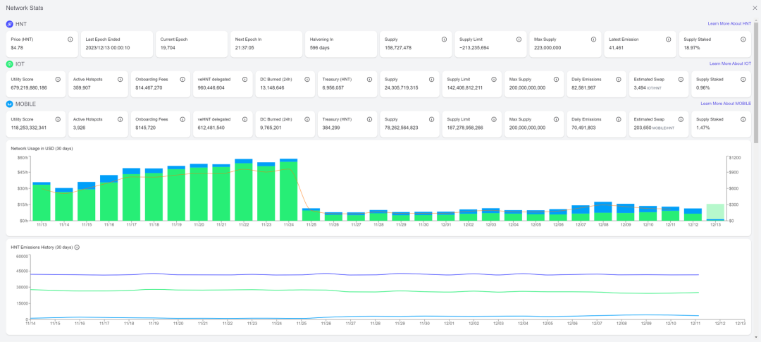 今年 Helium 发行了两个新的代币 $Mobile 和 $IOT,分别是 Helium Mobile 和 Helium IOT 两个 subDAO 治理代币,目的是实现治理的分离。Helium Mobile 的 5 G 热点业务赚取的是 $Mobile;而 $IOT 用于奖励专注于运行物联网的节点。$HNT 仍然是 Helium 生态系统中的主要资产,作为唯一能支付网络数据传输的代币。