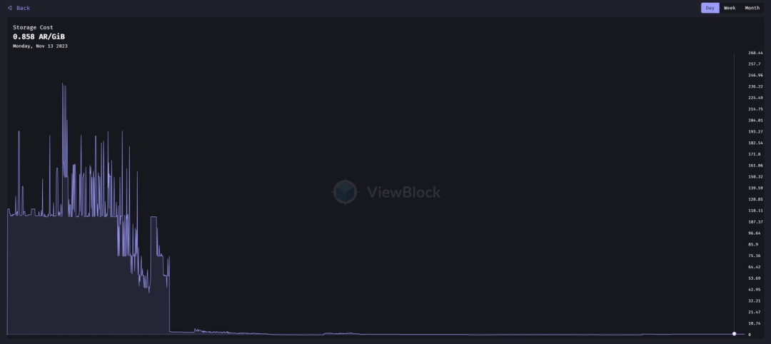 Arweave 目前每秒能够向网络添加约 170 条数据。虽然交易量按月持续增长,但 Arweave 的收费市场却保持稳定,保持在 0.858 AR/GiB,证明了 Arweave 的可扩展性。