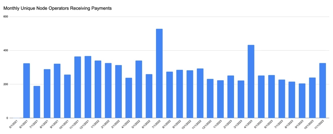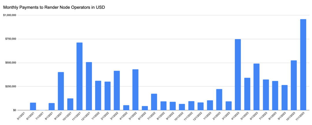 随着渲染需求的增长,以及 RNDR 价格上涨,节点运行者在 11 月份收到了 95.8 万美元,月环比增长 82% ,年同比增长 898% 。不过 OTOY 向 GPU 节点支付的款项通常会大幅延迟,因此峰值可能反映了前几个月的「追补」付款。