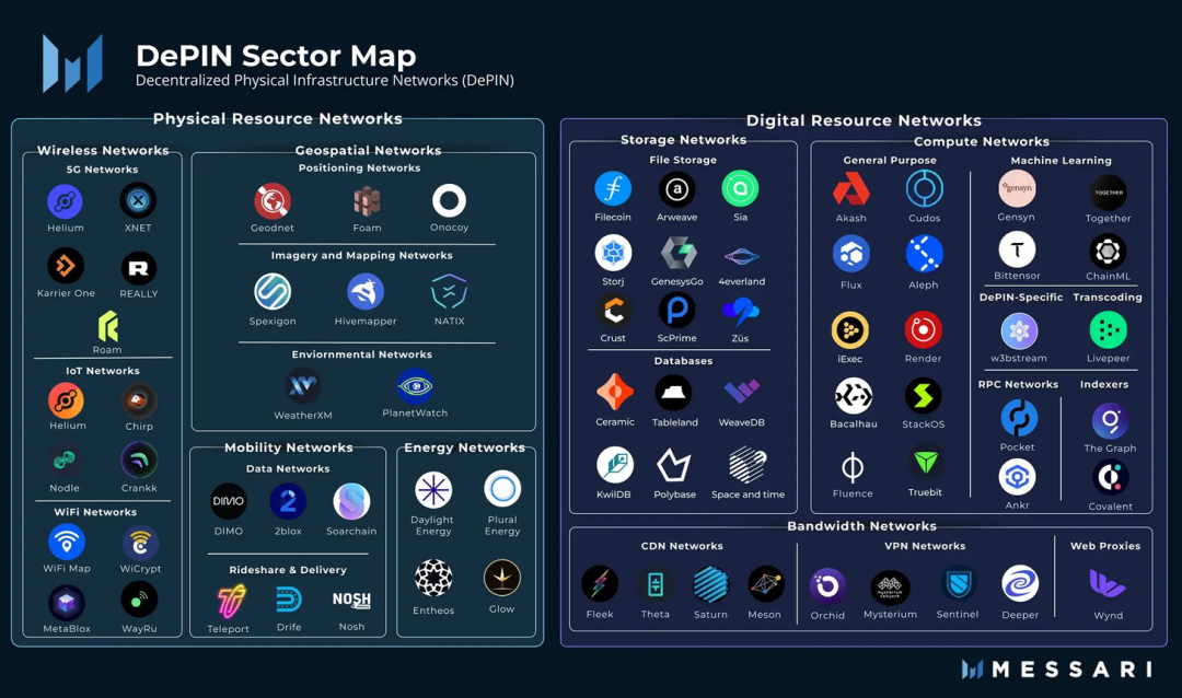 DePIN 涵盖的领域非常广泛,按照 Messari 的分类,可以分为物理资源(PRN)和数字资源 (DRN) 两大类。物理资源包括无线网络,地理空间网络,移动网络和能源网络;数字资源包括数据存储,算力,和网络带宽,每个小领域又有更细的分类。