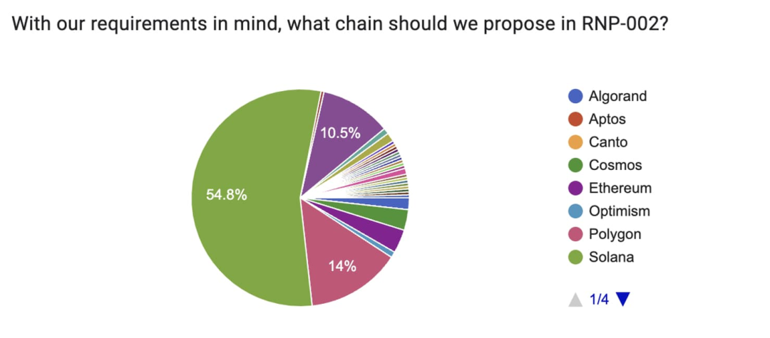 关于网络迁移的目的地,社区投票里有超过半数的用户选择迁移到 Solana。由于 Render Network 已经达到每年百万帧的工作处理量,并且这一需求随着 AI 的发展会逐步增加,因此对链上同步效率、吞吐量、网络延迟以及成本都有更高的要求。Solana 的每秒交易量 TPS(4000)约是 Polygon 的 137 倍(29),成本约为 Polygon 的 1/5000 ,同时又有大量成熟的开发者,是个理想的选择。