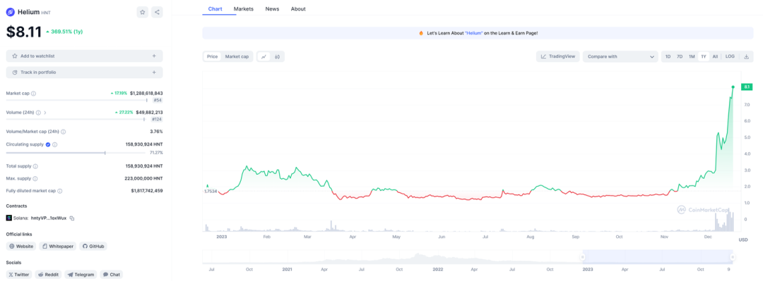 $HNT 是 Helium 生态系统中的主要经济资产,支付网络数据传输费用的唯一方法是燃烧 $HNT。目前市值 12.9 亿美金,在去年 10 月被 Binance 下架了现货交易对。