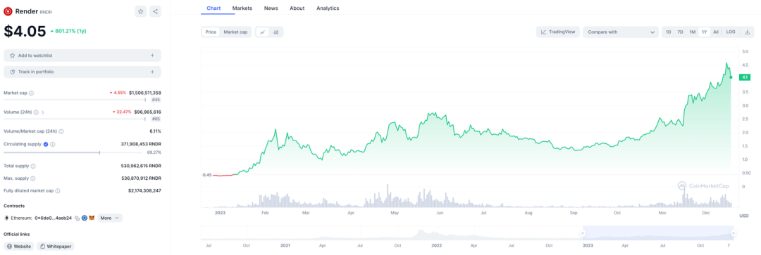 今年以来,$RNDR 涨幅达到 800% 。目前 MC 和 FDV 分别在 $ 1.5 B 和 $ 2.2B,市值排名第 51 。由于代币有真实的应用场景,可以看到代币价格和业务量的走势比较类似。Render 的业务资源强,今年和 Stable Diffusion 开展 AI 图片渲染的合作,也出现过在苹果电脑的宣传片中,已经为 HBO、Netflix 等公司提供服务,AI 的迅速发展也大大提高了项目上限。