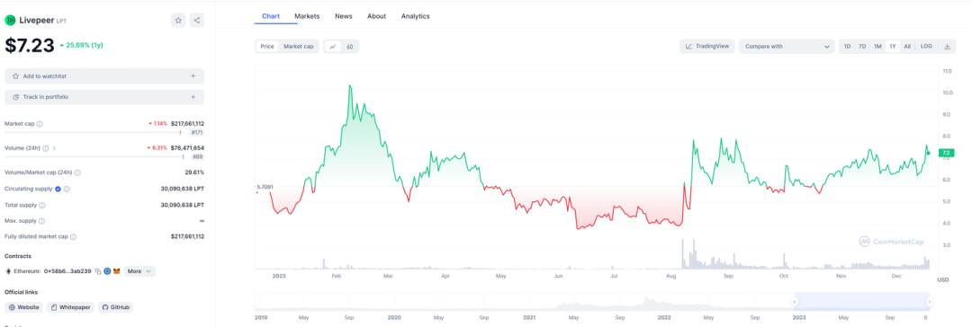 LPT 目前市值在 $ 217 M,在 8 月份的时候有一波底部的极速拉升,交易量一天放大三十倍,价格也在一周内完成翻倍,但是整体相较年初的价格还是亏损的。协议全年收入估算在 29 万美元,没有太强的业务现金流。