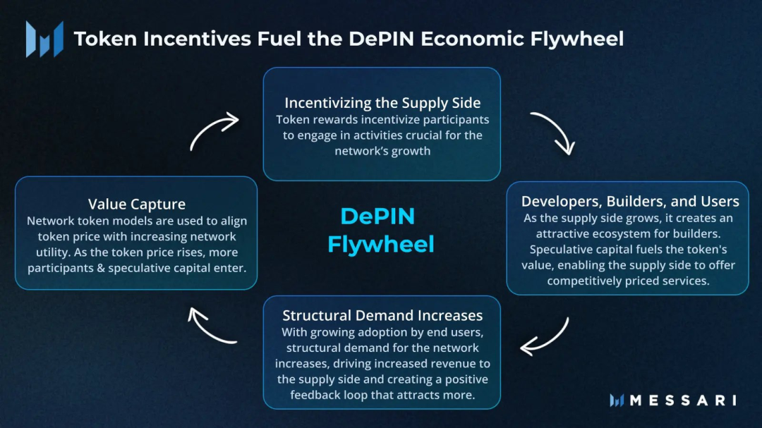 DePIN 赛道的基本飞轮逻辑是通过代币经济激励更多的供给端参与,有了充足的资源供给就会产生价格竞争,充足的资源和好的价格就会促进需求,有了需求就让代币有了价值捕获,能更好地推动价格上涨,吸引更多的资源供给者。