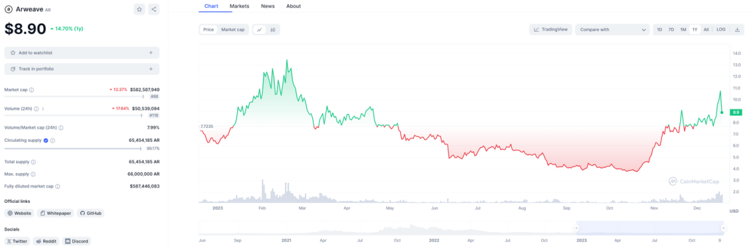 $AR 目前基本是全流通的状态,MC 目前 $ 583 M,业务量与 Filecoin 相当,市值是其 1/4 ,业务增量明显,代币涨幅还不多。