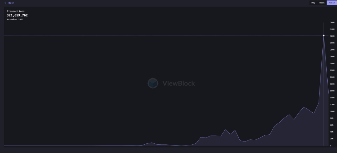 Arweave 的合作方多,生态系统丰富,Solana、 Nervos 采用 Arweave 作为默认的数据存储层,也通过其中间件项目 KYVE 为 Avalanche、Near 等多个公链提供数据存储服务。截至 2023 年 11 月,Arweave 的月交易量已达到 3.21 亿次。11 月份的月交易量同比增长超过 159% ,环比增长约 9.4 倍。