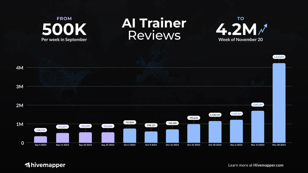 Hivemapper 的地图人工智训练已投入运行,可根据道路图像自主生成地图特征,每月有 2000 多名人工智能训练员负责验证系统的输出结果。9 月份每周平均有 50 万条训练结果,进入 11 月份后迅速增长,周超过 420 万条。