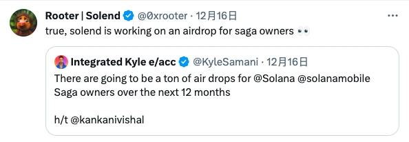 Solend (SLND):细节未确认,但其创始人 Rooter 已确认会对 Saga 持有者进行空投;