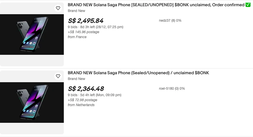 最后一种潜在的创收途径就是二手转卖了,如前文所述,目前 Saga 在 eBay 上的二手转卖售价已超过 2000 美元,一般卖家都会备注是否已申领 BONK 空投, 但即便是抛除掉 BONK 的空投价值,Saga 的转售价格依旧较 599 的官方售价有较大的盈利空间。