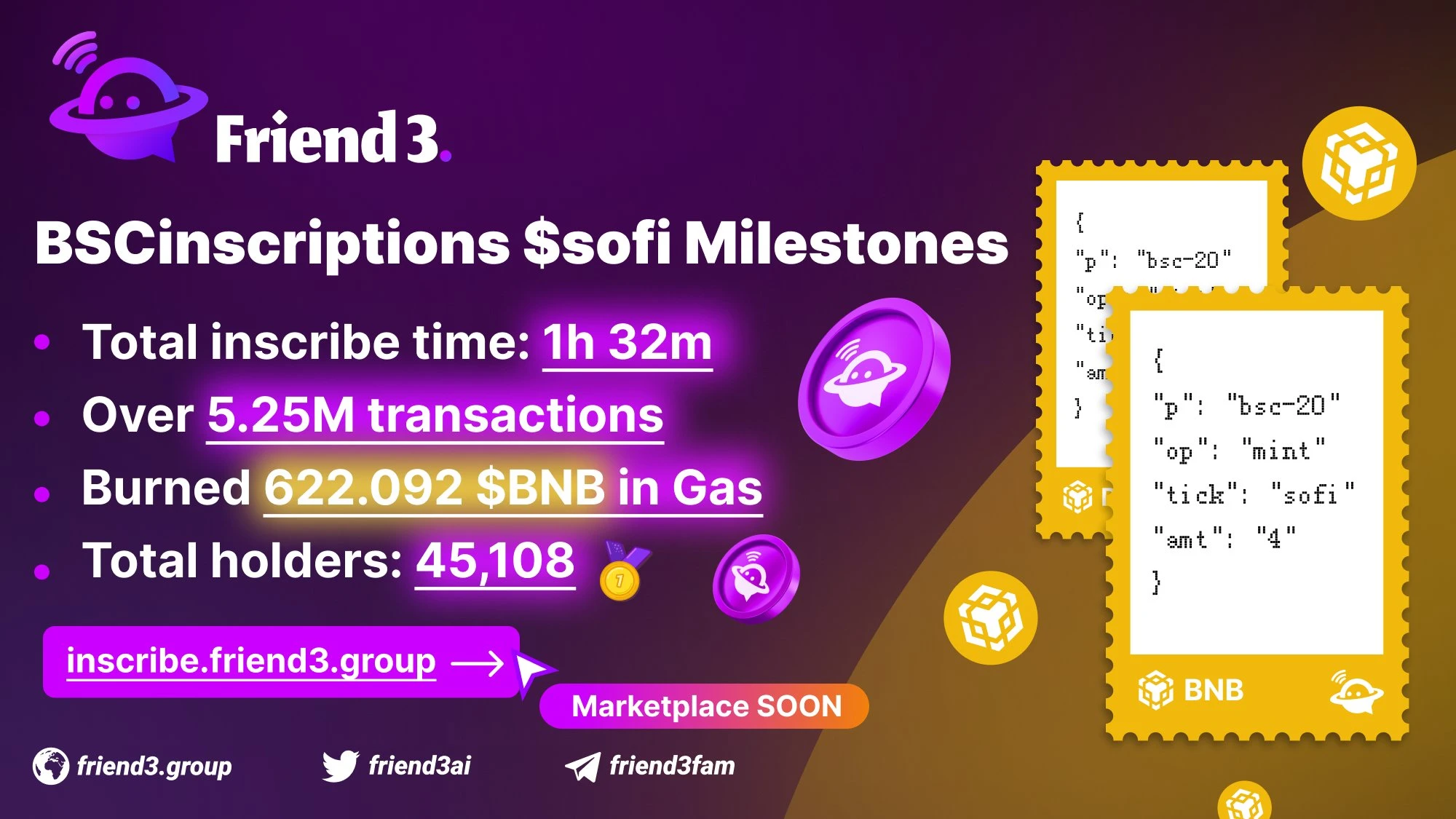 SOFI 是由 Friend 3 发行的首个铭文, 主体公司已发过代币 F 3 ,有铭文与代币结合的预期。