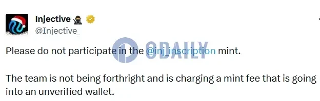 虽然 INJS 推迟了一次铸造时间,并且需要收费铸造(0.03 INJ 打一张),但还是有很多“手搓党”在 19 号晚上准时赴约。然而问题很快出现, 刚开始铸造不久, Injective 官推发布的一句“请不要参与铭文项目 INJS”,使得铭文社区炸开了锅;付费打到的用户开始不断在 INJS 官推评论中攻击项目方,要求退款。(图 4-1)