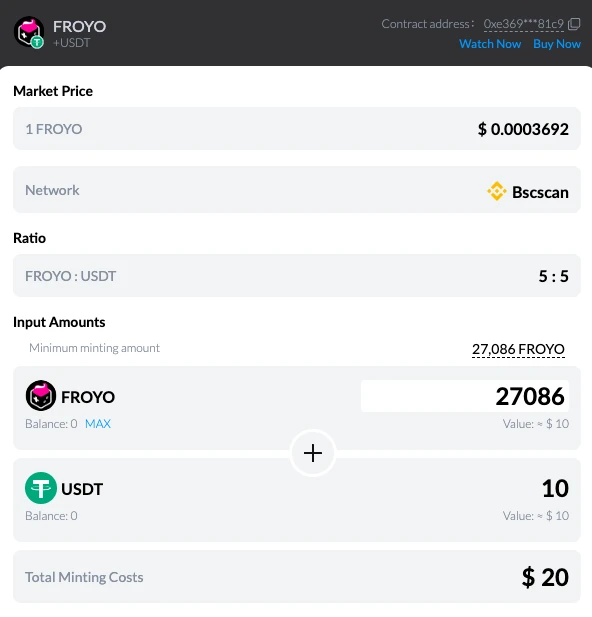 接下来,我们随便选择一种代币(比如排在最前方 FROYO)进行后续造作。点击 Mint 按钮后,我们将看到 Noahswap 要求用户将 FROYO 与 USDT 以等值的比例(5: 5 ,每个币种的组合比例均不一样)进行打包“抵押”,继而铸造 NUSD。