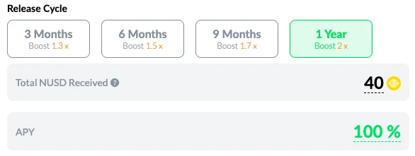 接下来便是“见证奇迹的时刻”, 如上图所示,用户存入的 FROYO + USDT 资产包价值为 20 美元,但如下图所示,Noahswap 允许用户铸造的 NUSD 数额却超过 20 枚。 具体来看,根据 NUSD 解锁时长的不同,Noahswap 允许用户铸造 1.3 倍至 2 倍的 NUSD,最高可铸造 40 枚 NUSD,名义价值实现了翻倍。