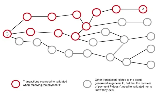 最终,由于使用了 UTXO 容器,一个 RGB 的合约的最新状态可以表示成一个有向无环图上还没有后代的点(每个点都表示一个存放在 UTXO 容器内的状态)。并且,对下图中的所有者 P 来说,他将只知道从合约的初始状态 G 到达他的过程,也即红圈标注的过程,而对灰色的点一无所知: