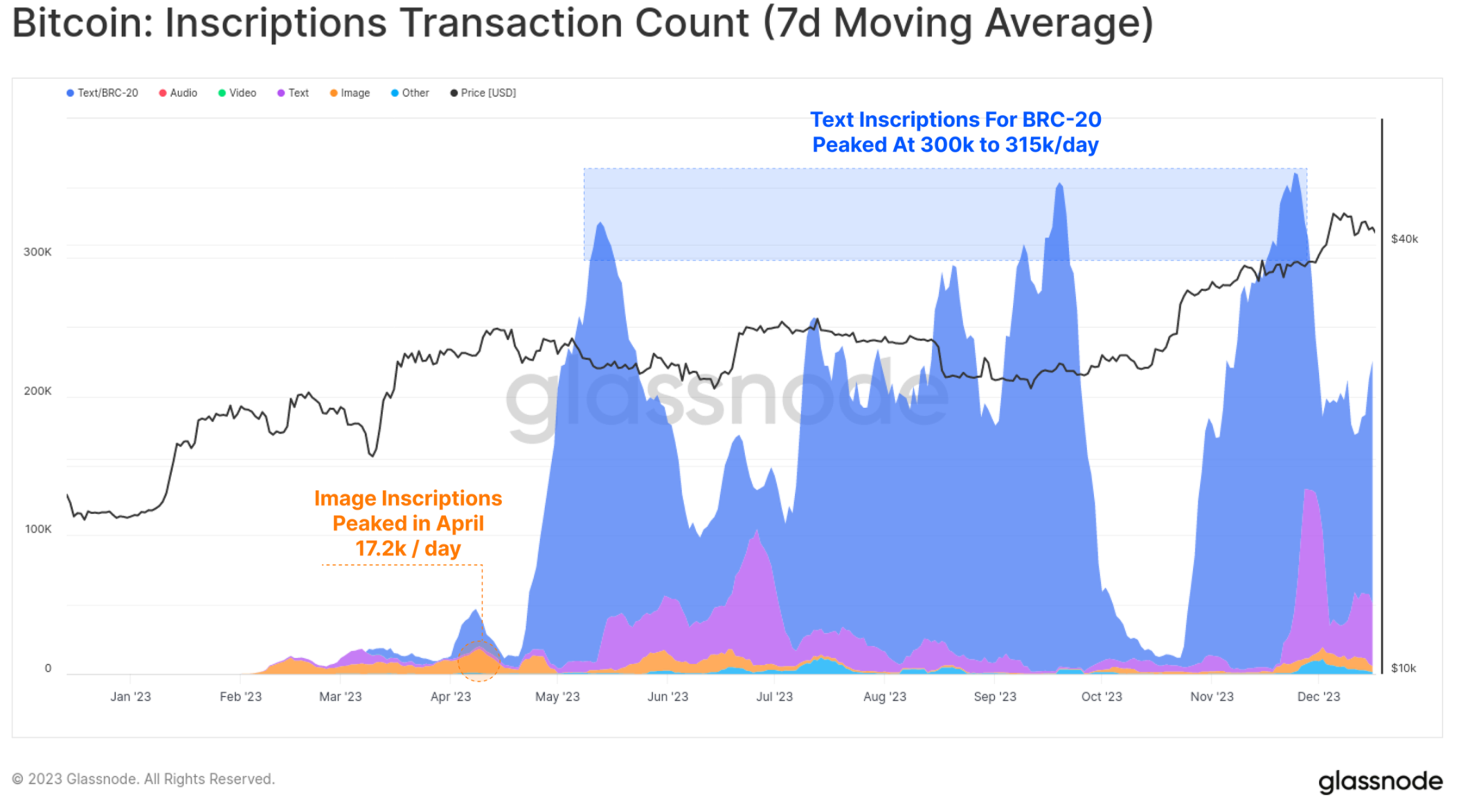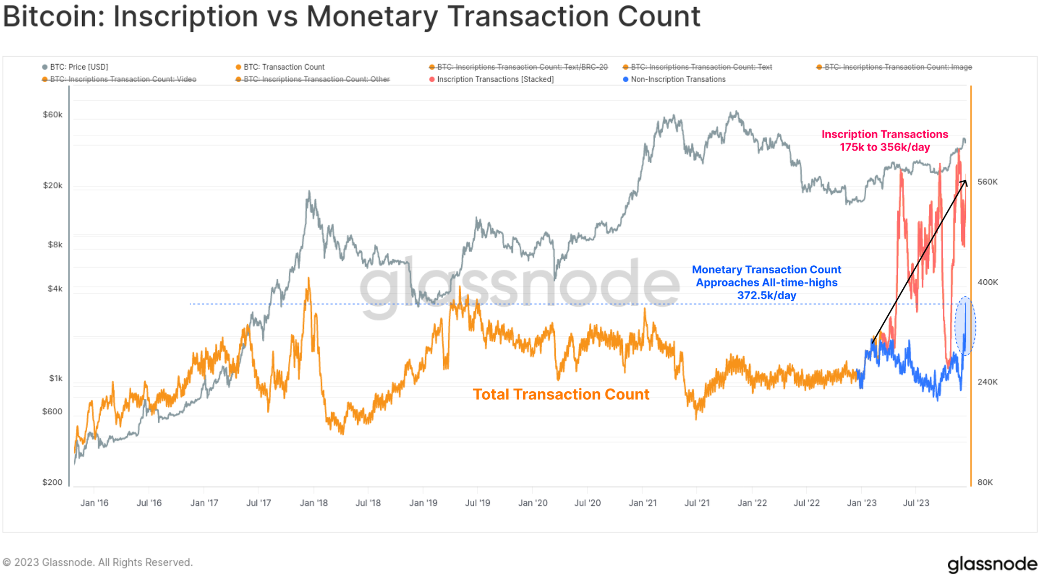 今年,比特币交易数量创下历史新高,这主要是由于序数和铭文的意外增长。这些交易将文本文件和图像等数据嵌入交易的签名部分。