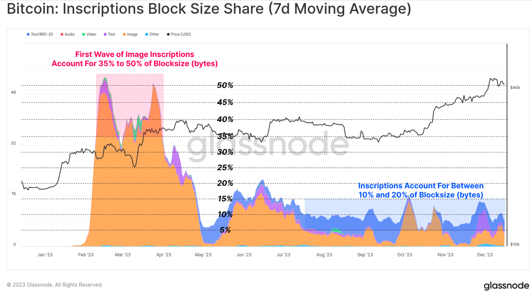 有趣的是,虽然铭文约占已确认交易的 50% ,但令人惊讶的是,它们仅占用区块空间的 10% 至 15% 左右。这是文本文件较小以及与 SegWit 数据折扣相关的细微差别(我们在 WoC-39 中介绍的主题)的结果。