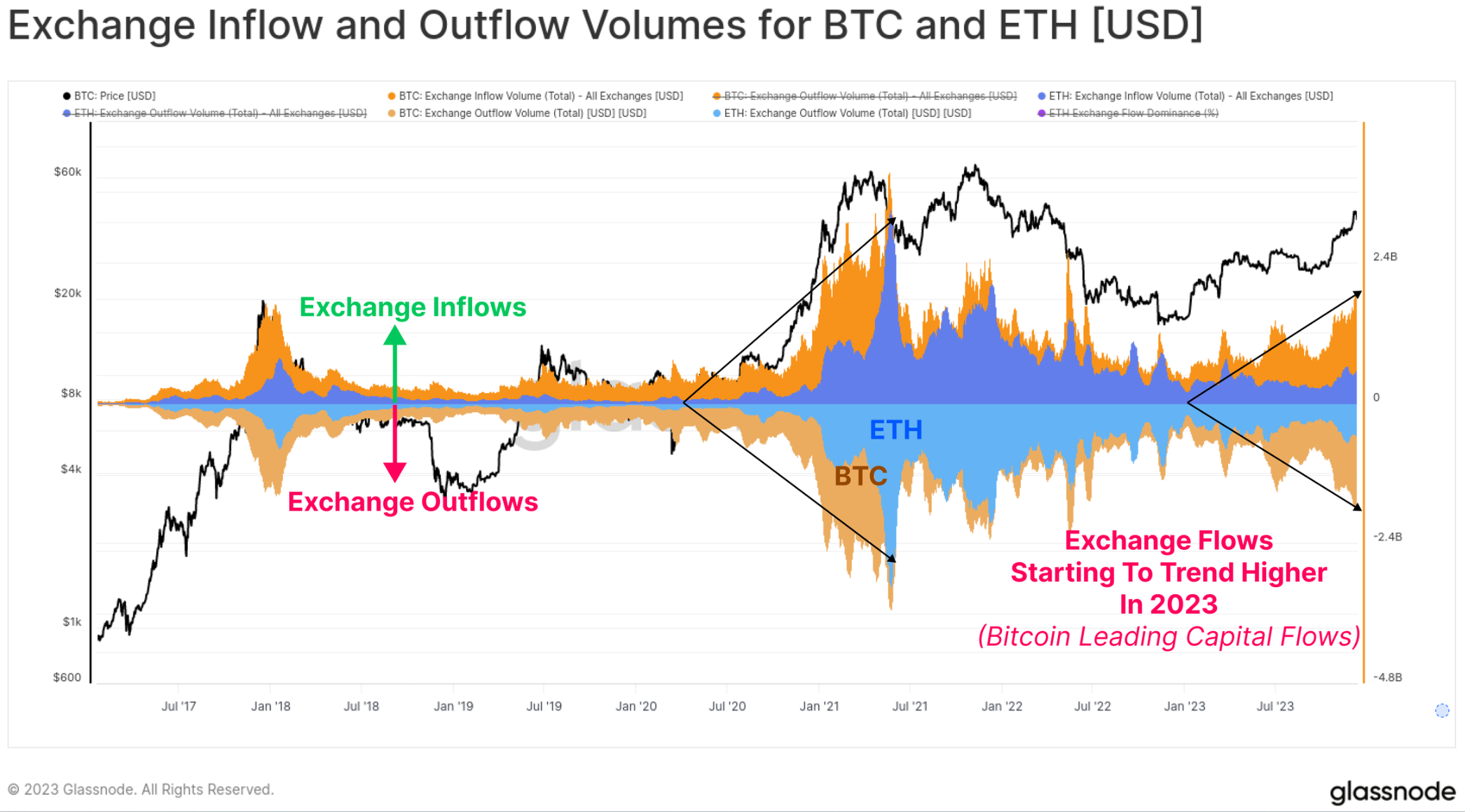 我们还可以看到,全年 BTC 和 ETH 的交易所流入和流出量有所增加,表明现货交易兴趣普遍扩大。值得注意的是,BTC 交易量的增长速度明显快于 ETH 交易量,这与比特币主导地位不断上升的观察结果一致。在长期熊市之后,比特币带领投资者信心走出低迷是很常见的,这张图表有助于直观地展示这一现象。