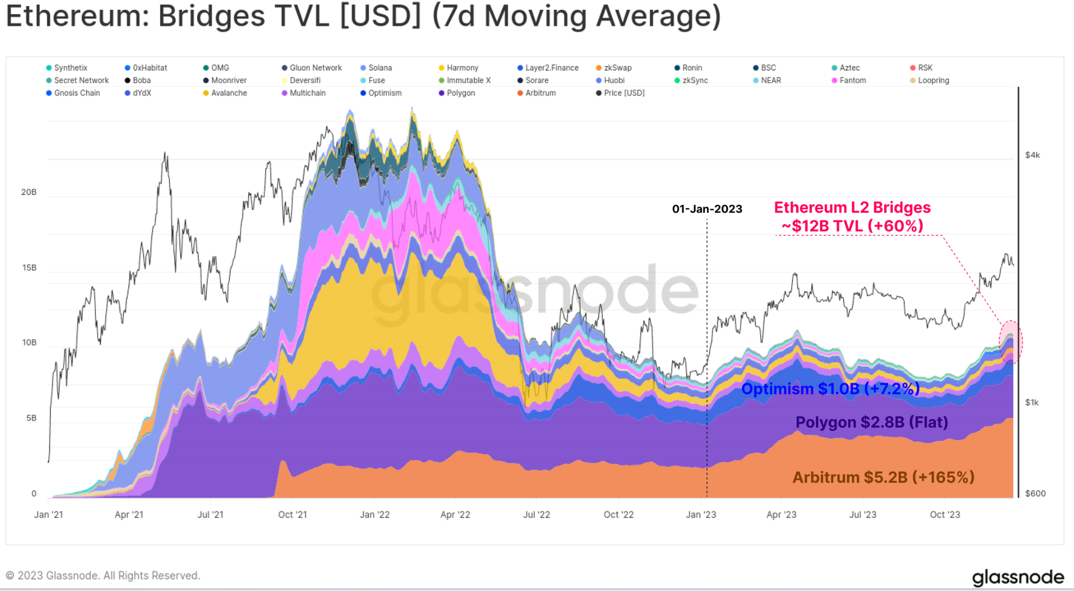 虽然 ETH 的市场价格总体表现落后于更广泛的数字资产领域,但其生态系统仍在不断扩大、成熟和发展。特别是,锁定在不断扩大的 Layer-2 区块链中的总价值增加了 60% ,其中超过 1 2B 美元现在锁定在桥中。