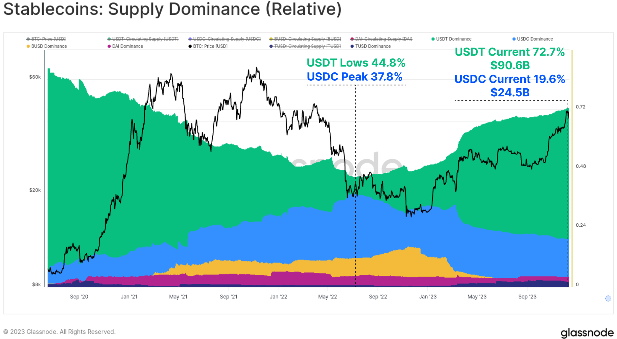 各种稳定币之间的相对主导地位在 2022 年至 2023 年间也发生了显着变化。此前上涨的稳定币如 USDC 和 BUSD 的主导地位已大幅萎缩,BUSD 进入仅限赎回模式,而 USDC 的主导地位自 2022 年 6 月以来从 37.8% 下降至 19.6% 。