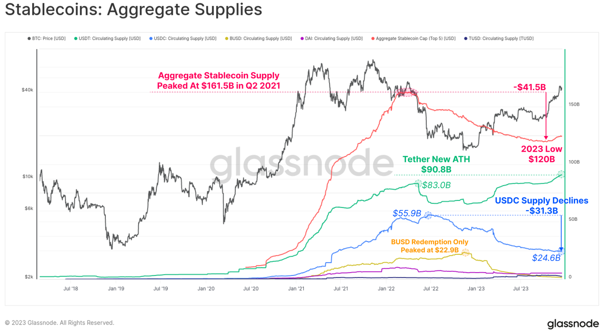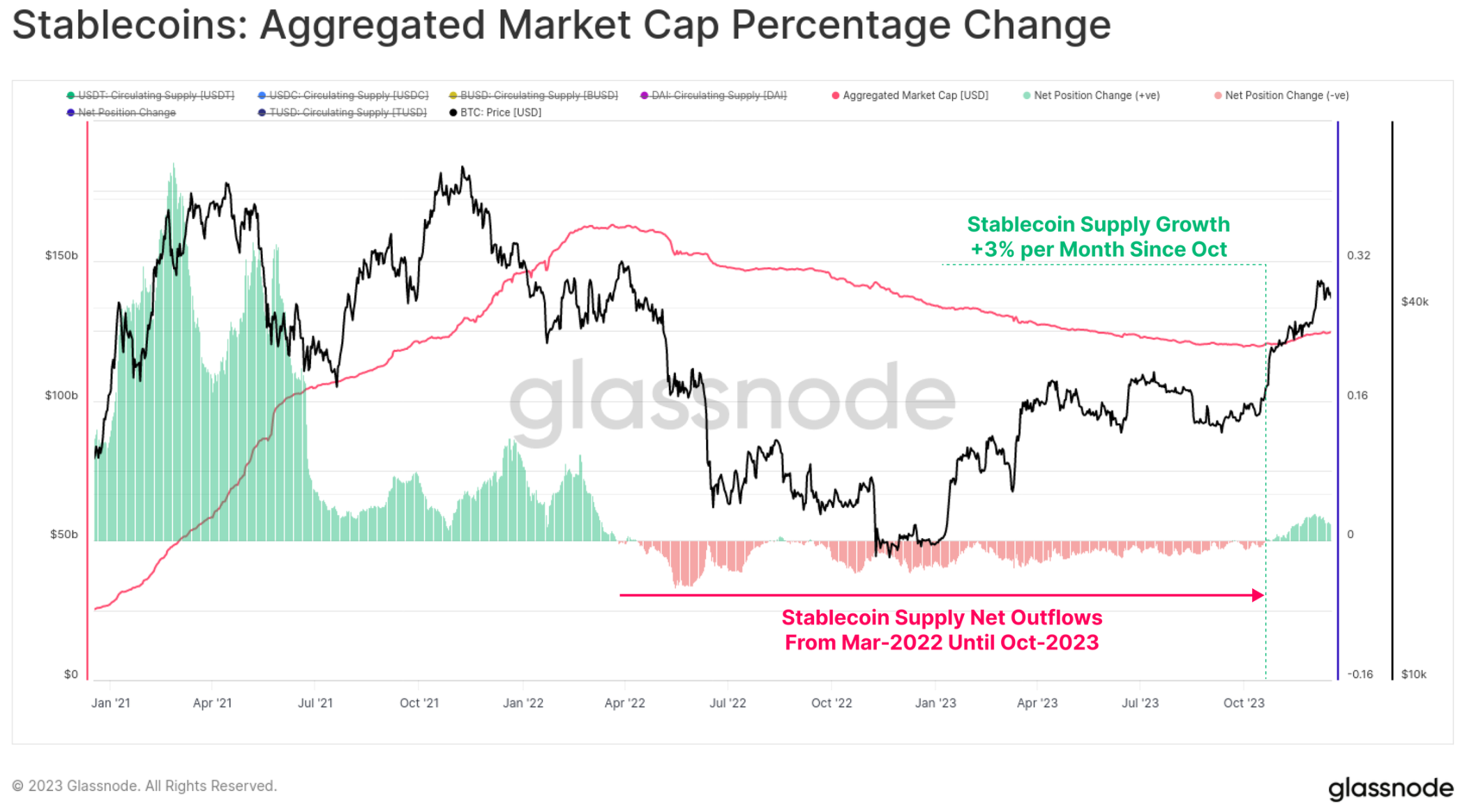 然而, 10 月是一个关键点,稳定币总供应量触底于 $ 120 B,供应量开始以每月高达 3% 的速度增长。这是自 2022 年 3 月以来稳定币供应量的首次扩张,也可能是投资者兴趣回归的迹象。