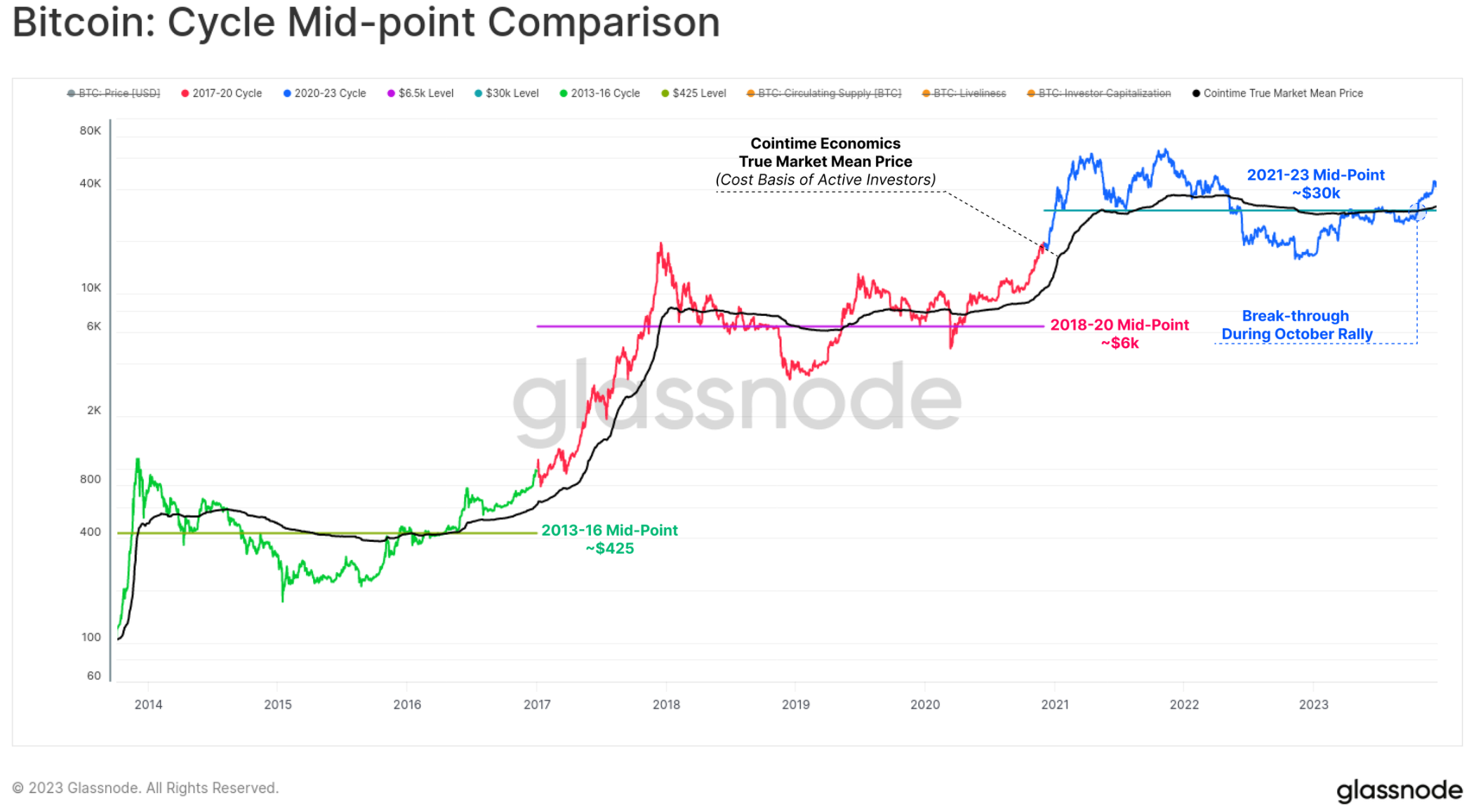 1、技术市场中点: 作为熊市早期的支撑位和熊市后期的阻力位的广泛价格水平。在本周期中, 3 万美元是一系列投降性抛售之前的最后一个主要支撑区域,最终导致 FTX 崩溃。