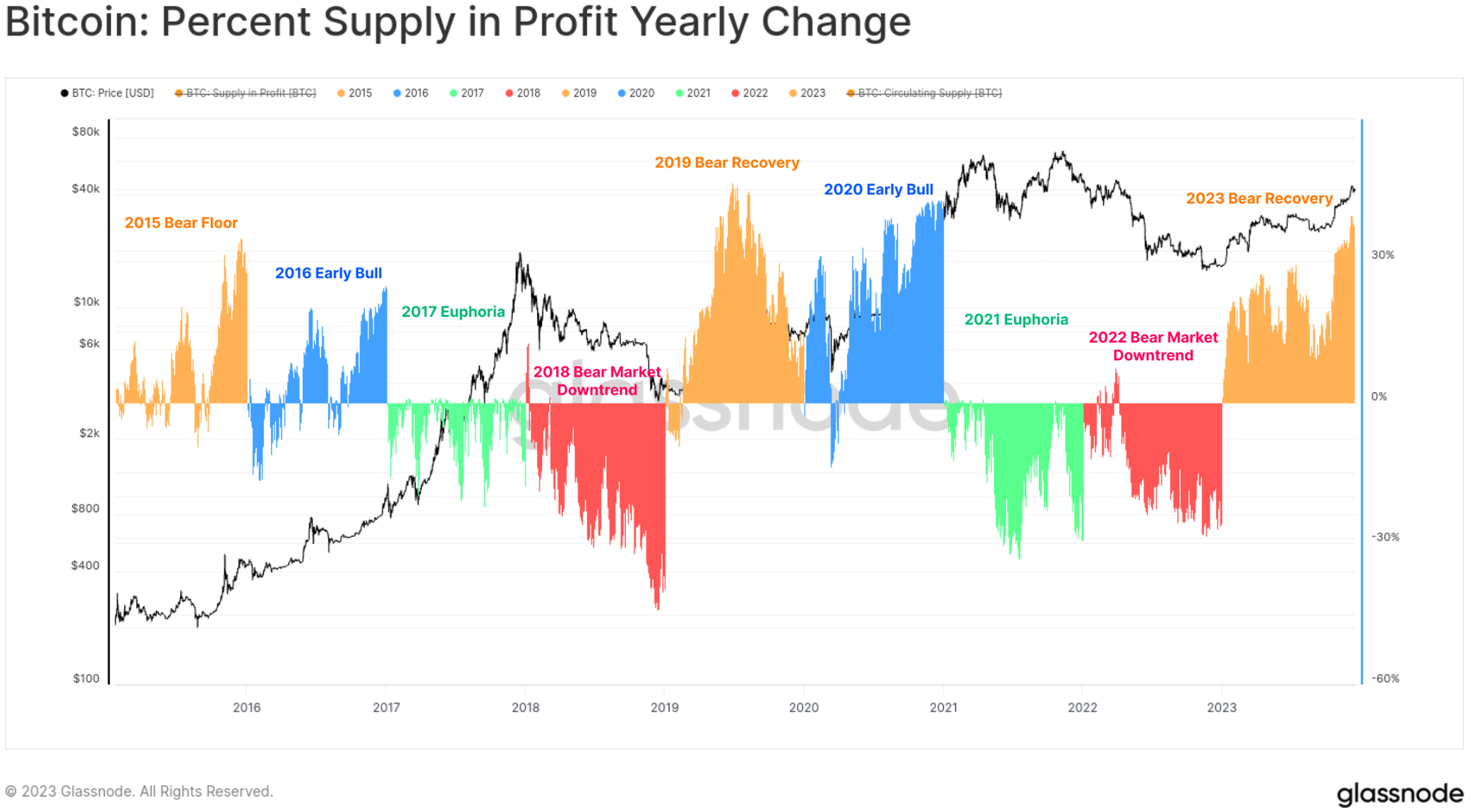 下图直观地展示了自 2015 年以来每个日历年的利润供应百分比变化。虽然按年份划分并不完美,但经典的四年比特币周期使我们能够发现一些有趣的模式: