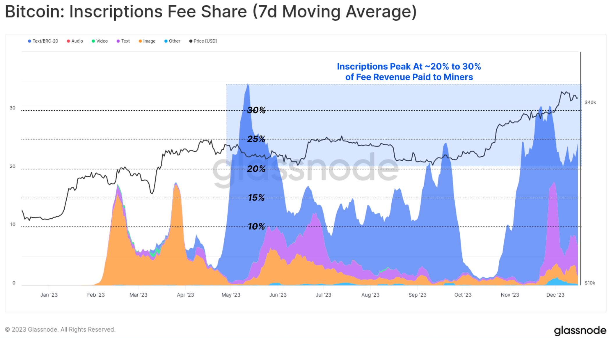 今年,铭文贡献了矿工总交易费收入的 15% 至 30% 。这凸显了 SegWit 折扣的不直观本质,其中铭文交易消耗了一小部分区块空间(以字节为单位),支付了相当大比例的费用,但也占所有已确认交易的一半左右。