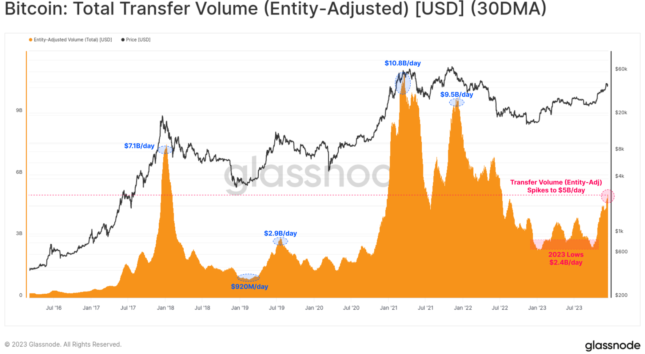 我们可以看到,在此之前,比特币的交易量相对停滞,这支持了“ 10 月份在某种程度上是市场阶段性转变”的观点。10 月份的上涨促使比特币的转账量翻了一番,从每天 2.4 B 美元增加到每天超过 5.0 B 美元,这是自 2022 年 6 月以来的最高水平。