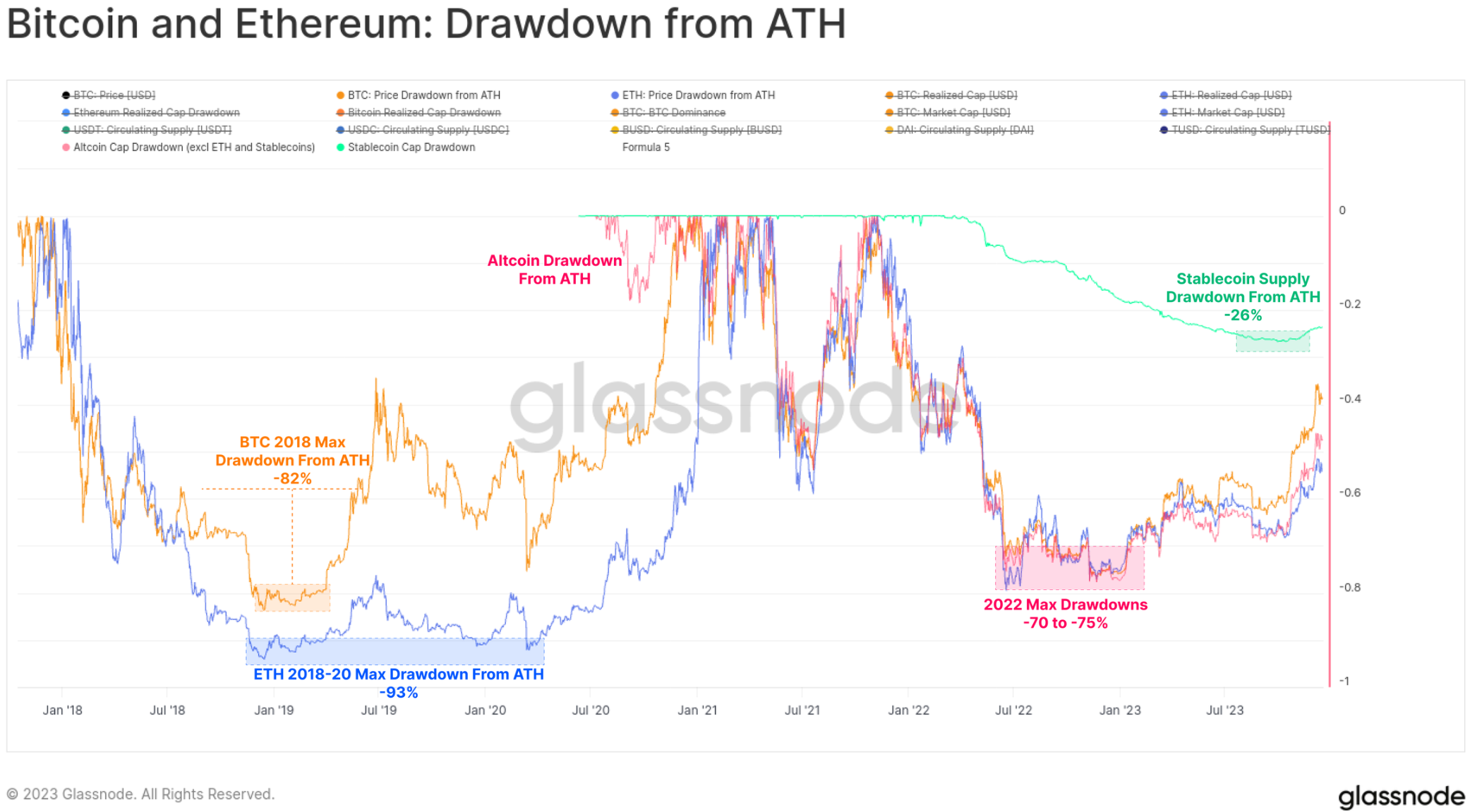 2022 年熊市的残酷程度略低于 2018-20 年熊市周期,大多数主要数字资产从 2023 年开始均较 ATH(历史新高)下跌 -75% 。自低点以来的强劲表现弥补了大部分损失。主要资产目前落后于其 ATH -40% (BTC)、-55% (ETH)、-51% (山寨币,不包括 ETH 和稳定币)和稳定币供应量(-24% )。