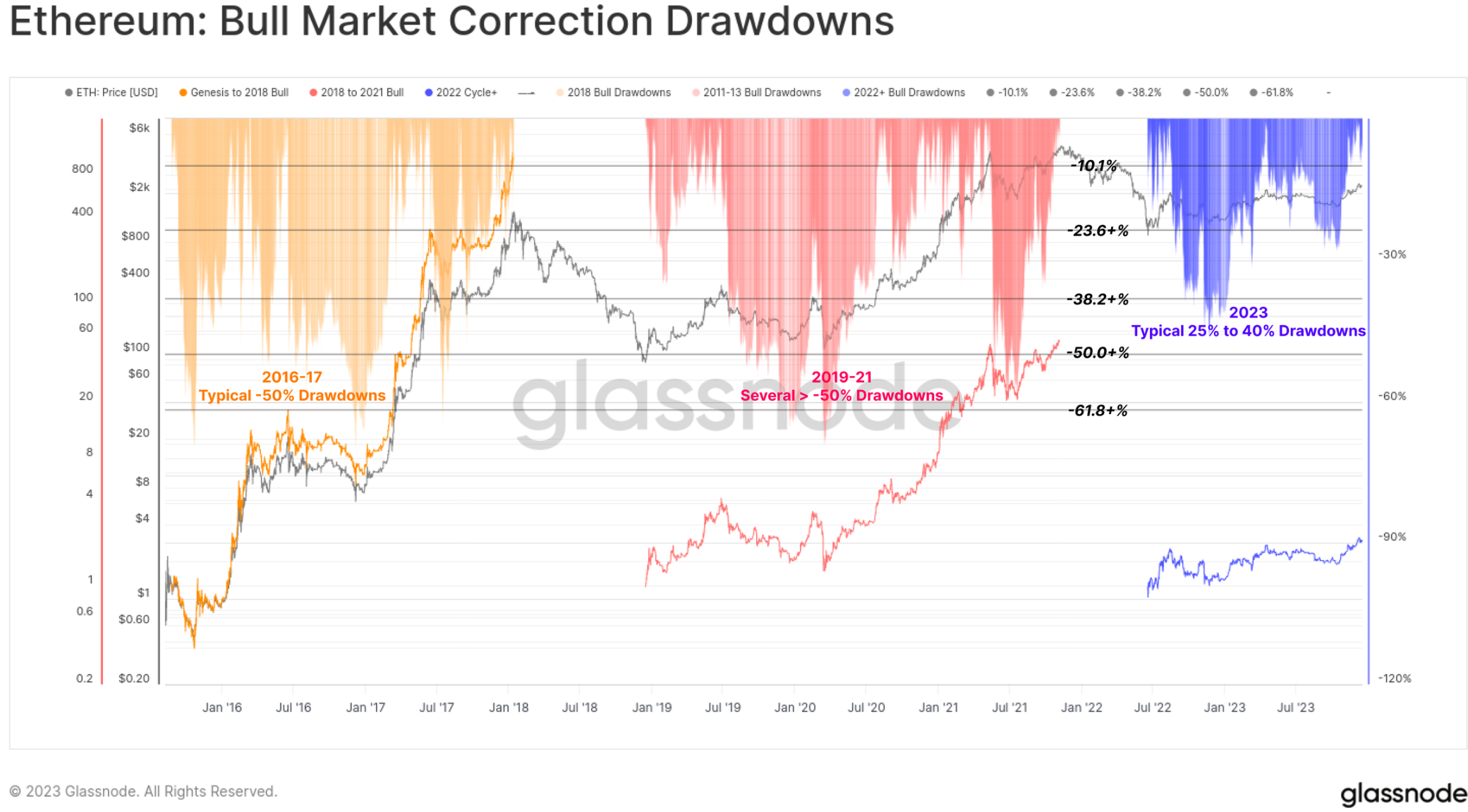 2023 年市场的显着特征之一是所有价格回调和调整的深度都非常浅。从历史上看,BTC 的熊市复苏和牛市上升趋势期间通常会从局部高点回调至少 -25% ,许多例子甚至超过 -50% 。