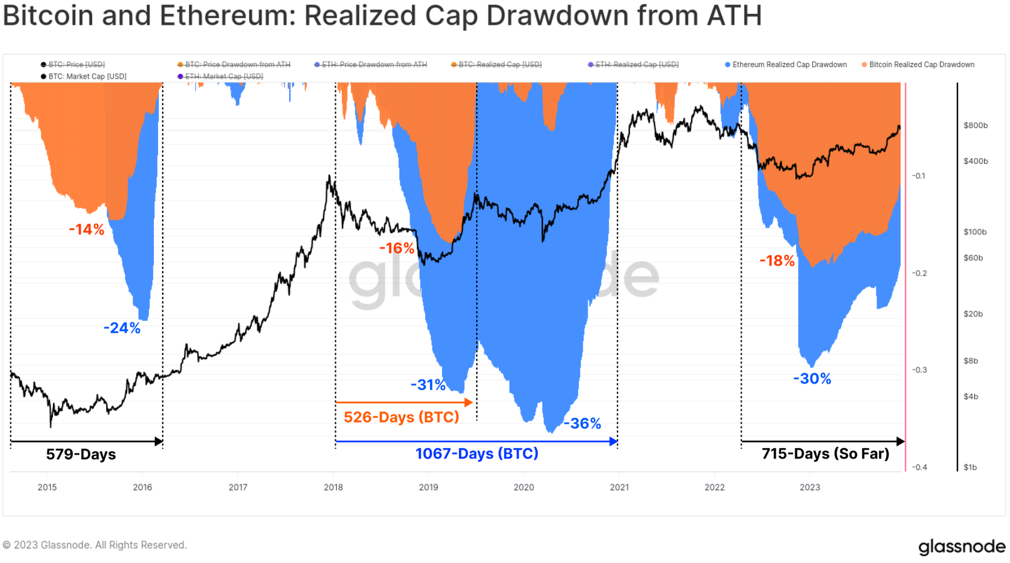 从链上角度来看,BTC 和 ETH 的已实现上限提供了一个出色的工具来跟踪各自资产的资本流动恢复情况。2022 年熊市期间的总已实现上限下降达到了与之前周期相似的水平,反映出 BTC 的净资本流出为 -18% ,ETH 的净资本流出为 -30% 。 然而,资本流入的恢复速度要慢得多,比特币已实现上限 ATerH 在 715 天前达到了 100% 以上。相比之下,在之前的周期中,实现上限的完全恢复大约需要 550 天。