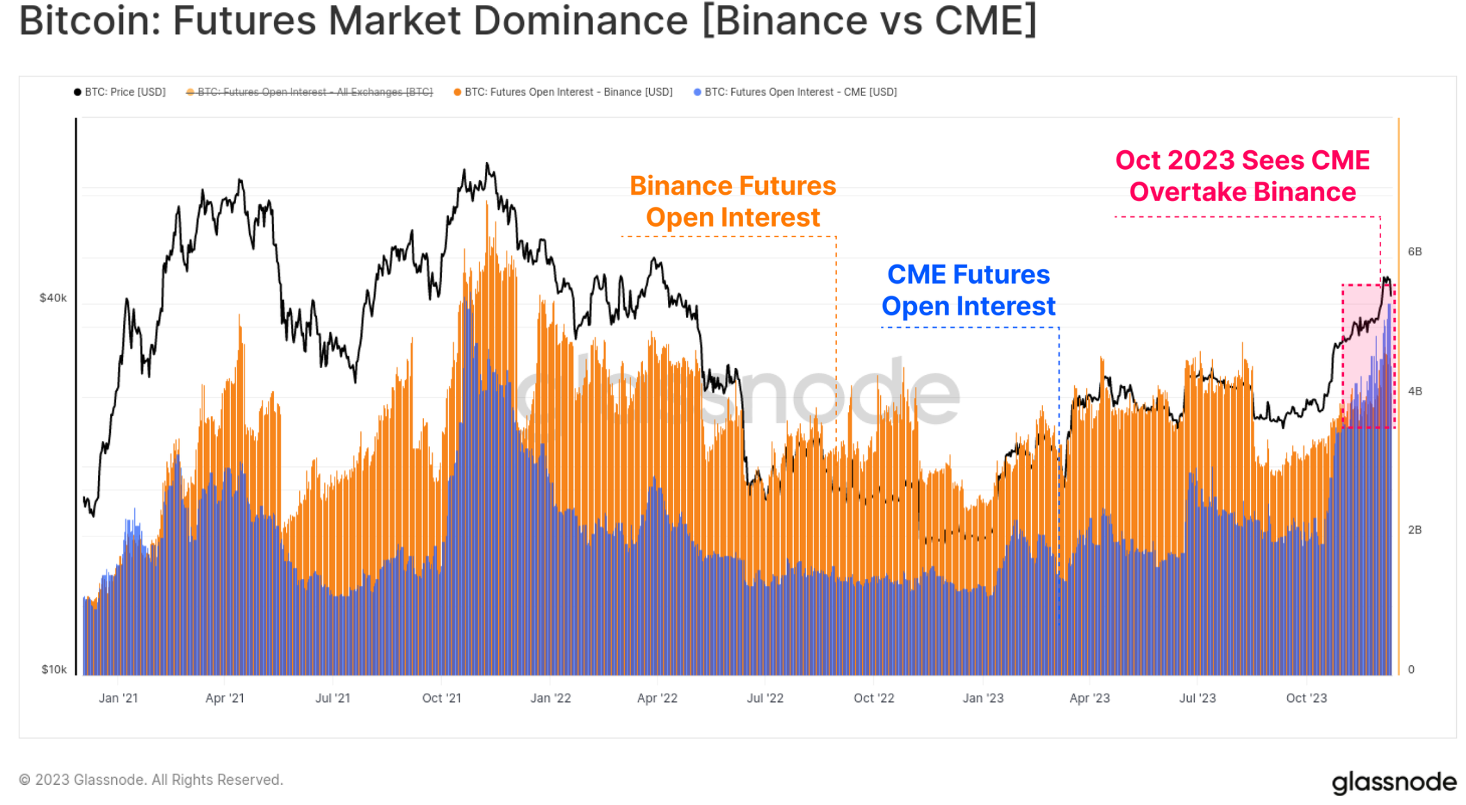 在期货市场内,也出现了值得注意的主导地位转变,受监管的芝加哥商品交易所 (CME) 交易所持有的未平仓合约历史上首次超过离岸交易所币安 ( Binance )。十月份似乎再次成为这一阶段转变的重要时刻,暗示着机构资本的涌入。