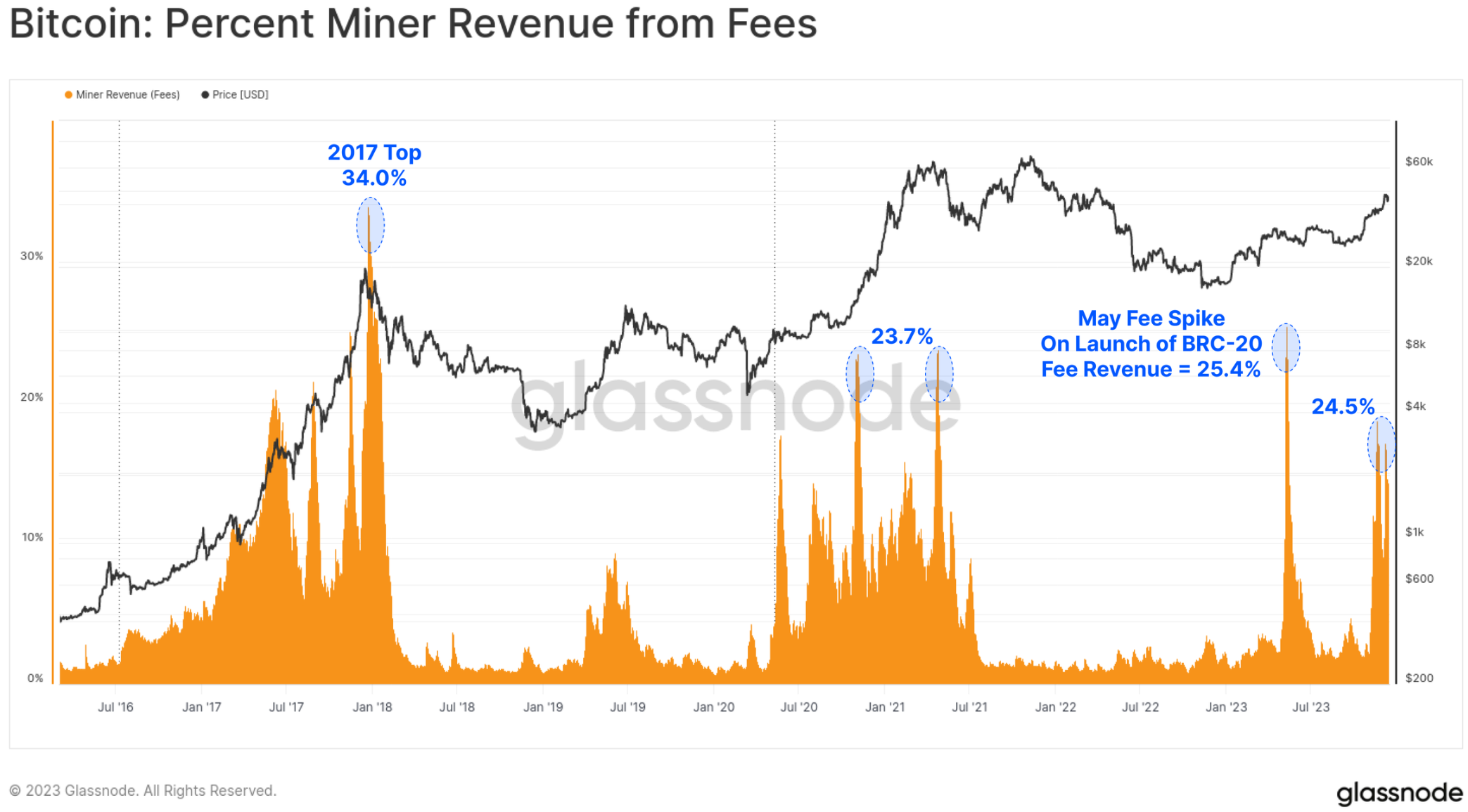 由于比特币区块空间的这个新买家,矿工的费用收入大幅增加, 2023 年有几个区块支付的费用甚至超过了 6.25 BTC 的补贴。今年出现了两次费用大幅上涨,目前费用约占矿工收入的四分之一。这与 2017 年和 2021 年牛市的欣快阶段相当。