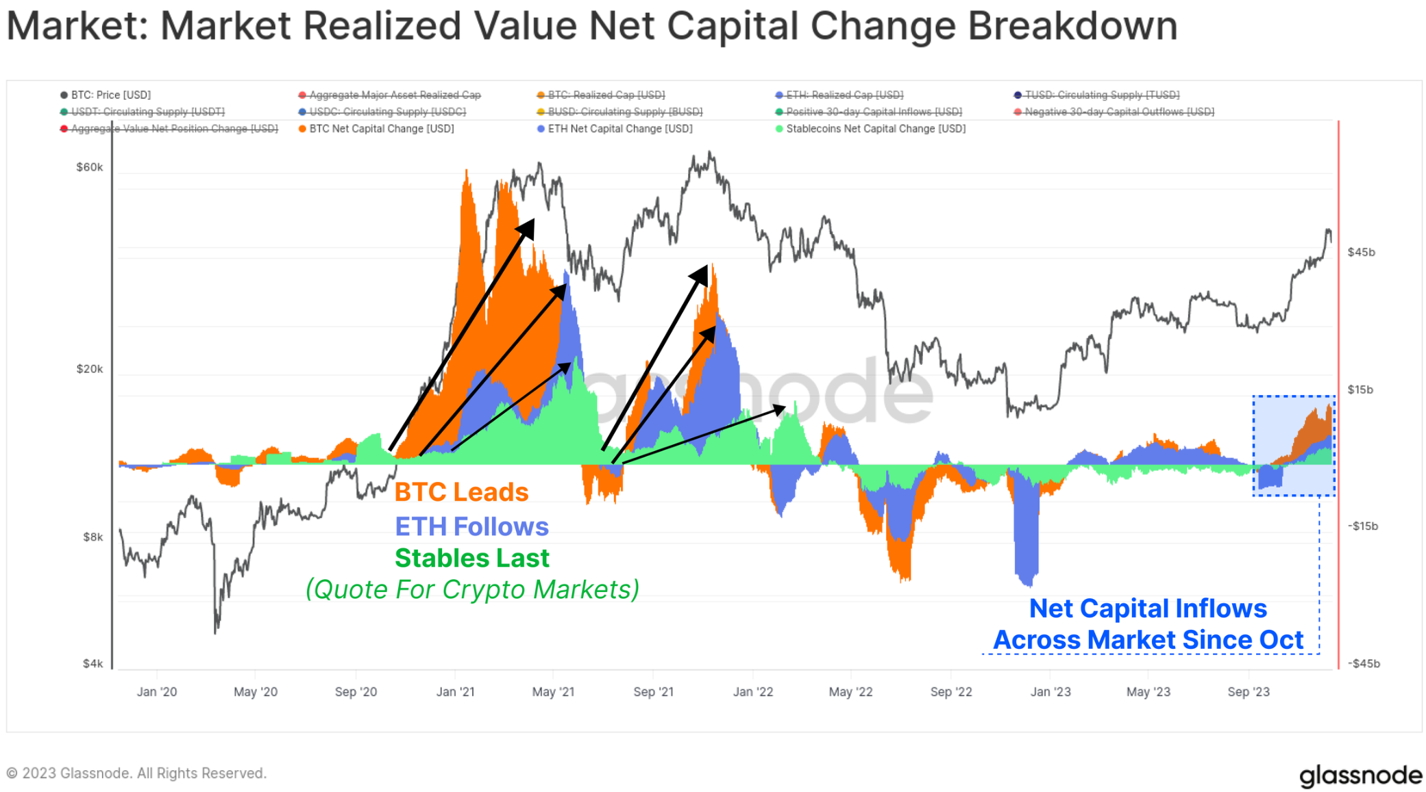 最后,我们可以将 BTC 和 ETH 的已实现市值 30 天的变化与稳定币总供应量的变化进行比较。这三个指标有助于可视化和衡量相对资本流动以及部门之间的轮动。