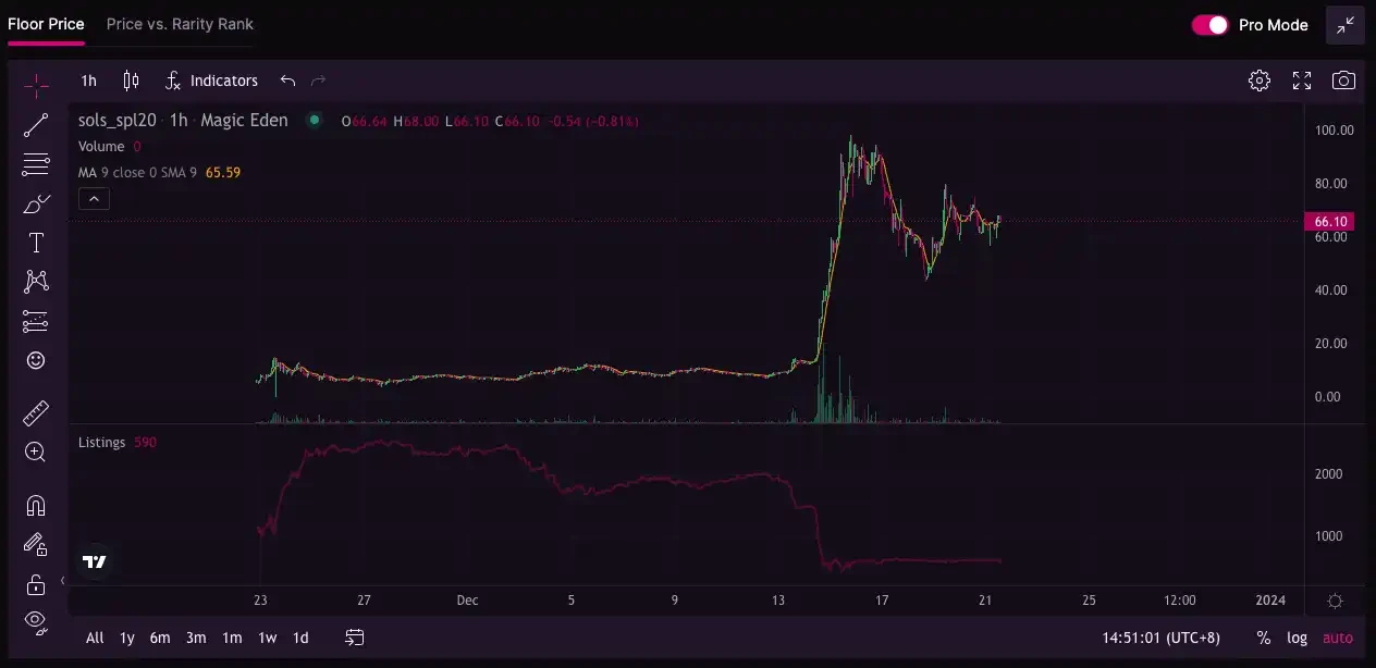 sols 在最初 mint 时就与其他公链铭文不同,同期的 pols 铭刻步骤极为简单,而 sols 则需要附带图片一起铭刻。mint 完毕后,成本几十 U 的 sols 在二级交易市场立刻就有 1 SOL 的交易价, 12 月 15 日,sols 在 Magic Eden 上的价格突破了 100 SOL。