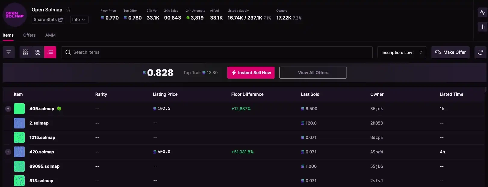 12 月 21 日,NFT 交易平台 Magic Eden 的 24 小时交易榜上出现了一个 NFT 系列「Open Solmap」。截至撰稿时,Open Solmap 地板价触及 0.77 SOL,有超过 230 k 个地块,当前持有人数超 17, 780 人。