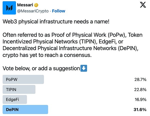 此前,对于DePIN这一新兴赛道并未有统一的描述。2019年,Multicoin Capital的合伙人Kyle Samani将相关的去中心化物理设施项目称为互联网设施层(Internet Infrastructure Stack)。2021年,专注于物联网公链的IoTeX将这一赛道命名为MachineFi,后续还出现了“Token Incentived Physical Network”等名称。在2022年11月,Messari对Web3物理基础设施赛道的名称进行了投票,并在年度报告和专题报告中使用DePIN,随后DePIN成为该赛道统一的名称。