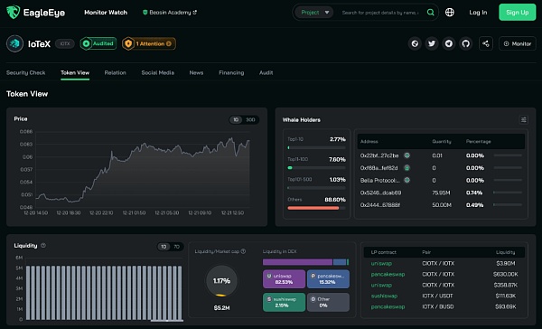 根据EagleEye链上数据分析,目前IoTeX的链上流动性主要存在于Uniswap交易池和其链上DEX Mimo,更多的流动性主要存在于中心化交易所 。其代币超90%全流通,市值约6亿美元。
