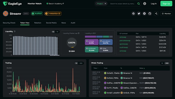 目前 Streamr 的市值超 7000 万美元,其代币为 DATA,基本全流通,目前价格波动较大。 据EagleEye检测,其代币合约存在一定的中心化风险 。