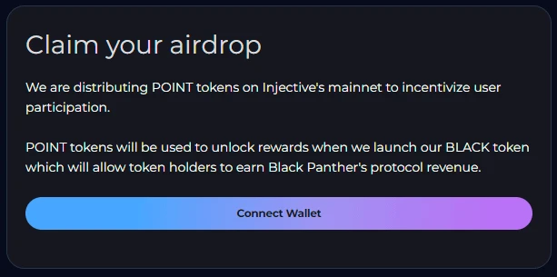 在 Black Panther dApp 中,可以找到一个标有“Airdrop”的选项。当使用 Injective 的主网时,用户有机会在 BLACK 代币推出时获得奖励。