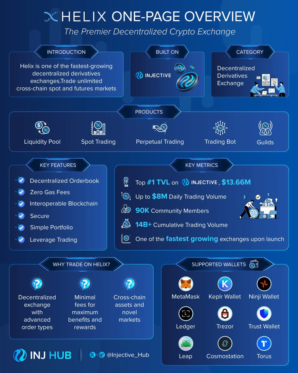 Helix 是一个 DEX 平台,用于加密现货和衍生品交易以及创建和运行基于 Injective 基础设施的金融应用程序。Helix 允许跨链加密资产和永续市场进行无限交易,并提供返佣。