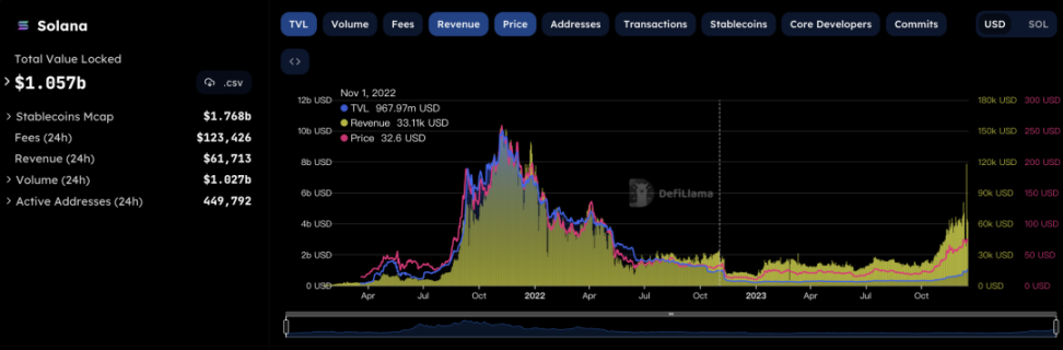 Solana 生态 TVL、Solana 价格及整条链收入走势图,数据来源:DeFiLlama