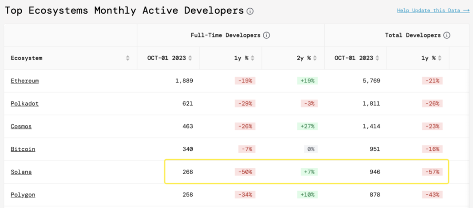 开发者是一个公链生态发展的基础,目前 Solana 生态开发者数量不多,全职和兼职开发者一共 946 位,在所有公链中位列第五, 和比特币生态开发者数量相差不大。